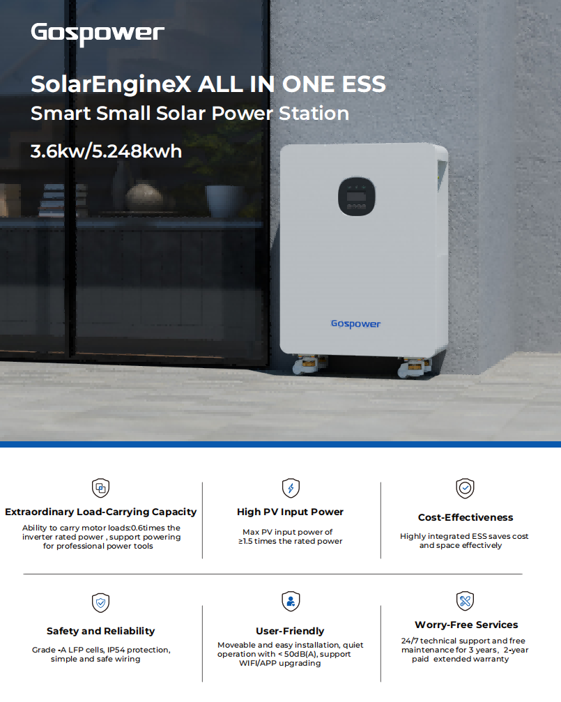 Gospower 3.6kW Smart Small Solar Power Station. The Gospower GPSO series all-in one energy storage system combines an inverter, MPPT solar charger, and battery. It supports a maximum of 12 units for paralleling. The battery capacity ranges from 5.12kWh to 20.48kWh with up to 4 units paralleling.